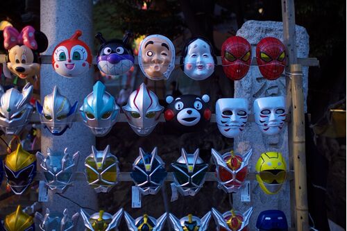深大寺から横浜に戻り、ビールを購入するため酒屋に立ち寄りました。その際、妻から「近くでお祭りやってるよ」という情報を聞いて、少しだけ覗いてみることに。 小さな神社ですが、結構な数の露店が出ていました。 いつの時代も、お祭りにお面は付き物です…